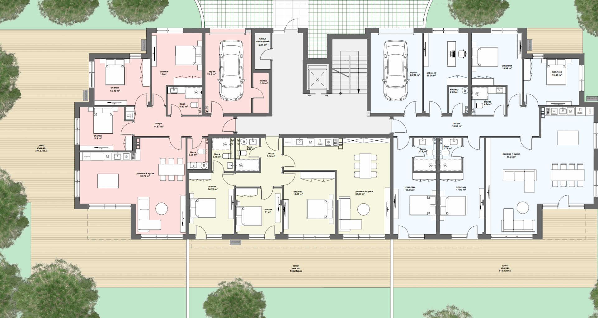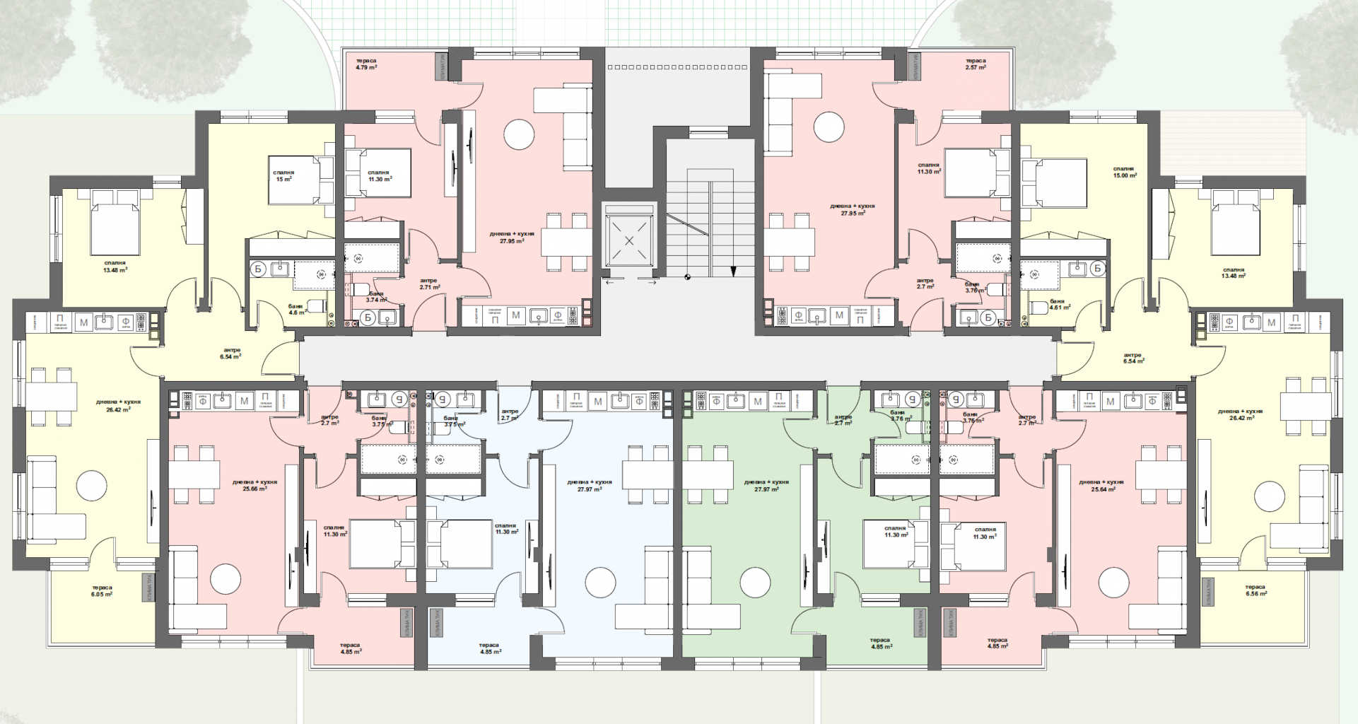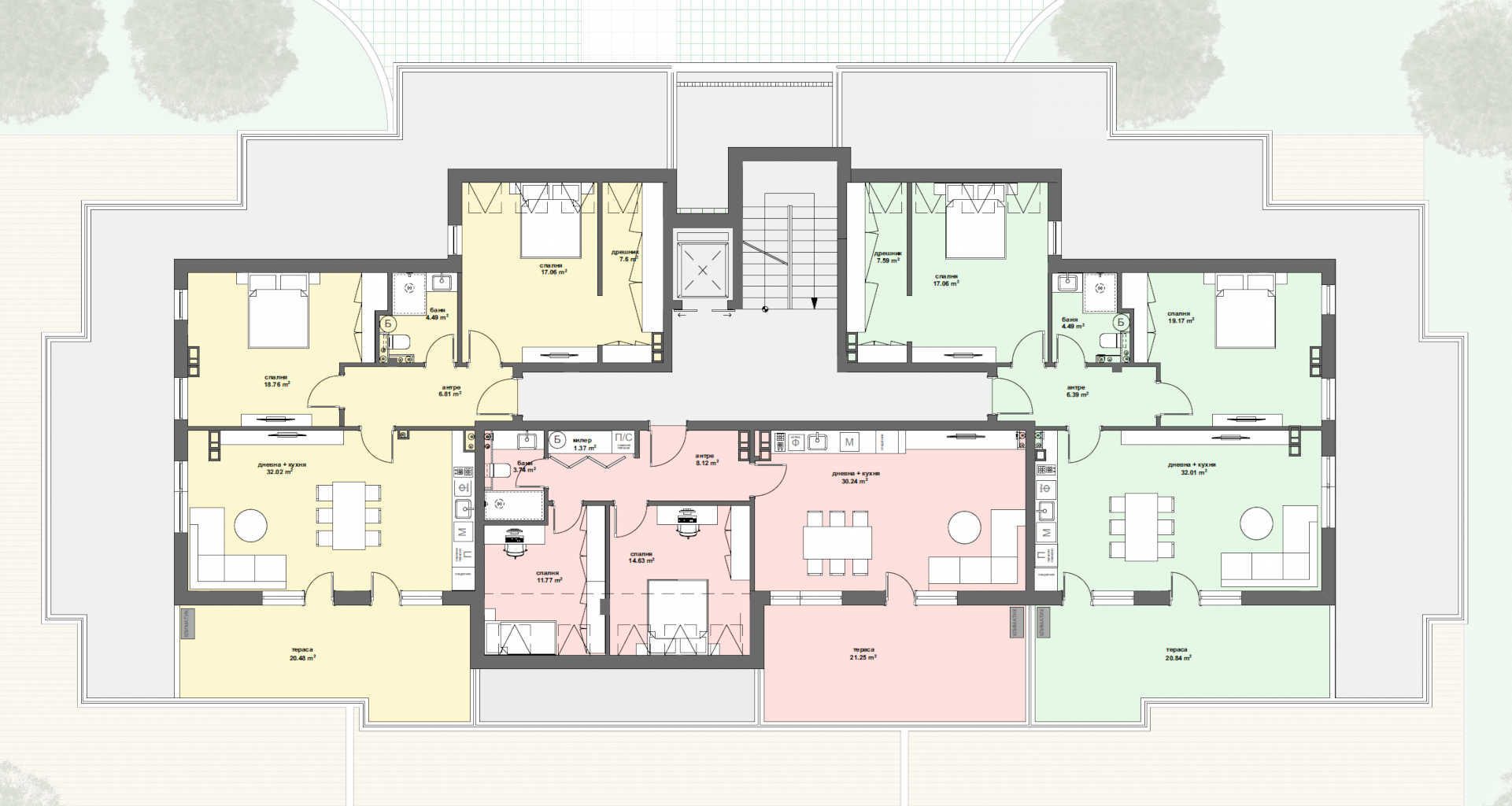 | Апартамент № 21 | 4 | Тристаен | Юг | 126.49 | Свободен |